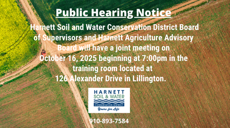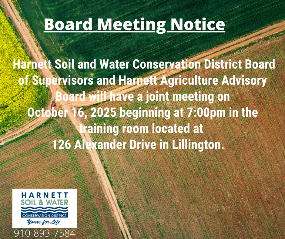 Harnett Soil and Water Conservation District Board of Supervisors and Harnett Agriculture Advisory Board will have a joint meeting on October 16, 2025 beginning at 7:00pm in the training … Read more