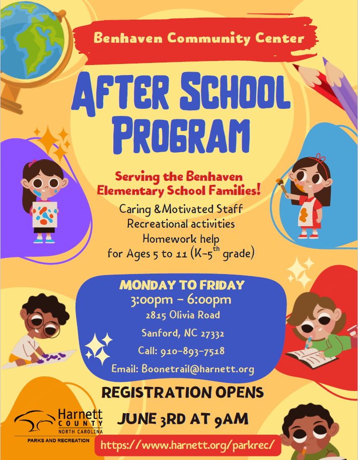 Harnett County Parks and Recreation’s afterschool care programs provides a safe, engaging, and nurturing environment for families requiring quality child care for after school. Our mission emphasizes creating an atmosphere that balances student enrichment, physical activity, free time in a stimulating and enjoyable setting, and time set aside to complete homework. The afterschool program offered provides parents with safe, convenient, reliable, and affordable out-of-school afternoon care for their children. The program maintains clear policies and procedures and actively encourages and welcome open communication and parent involvement.