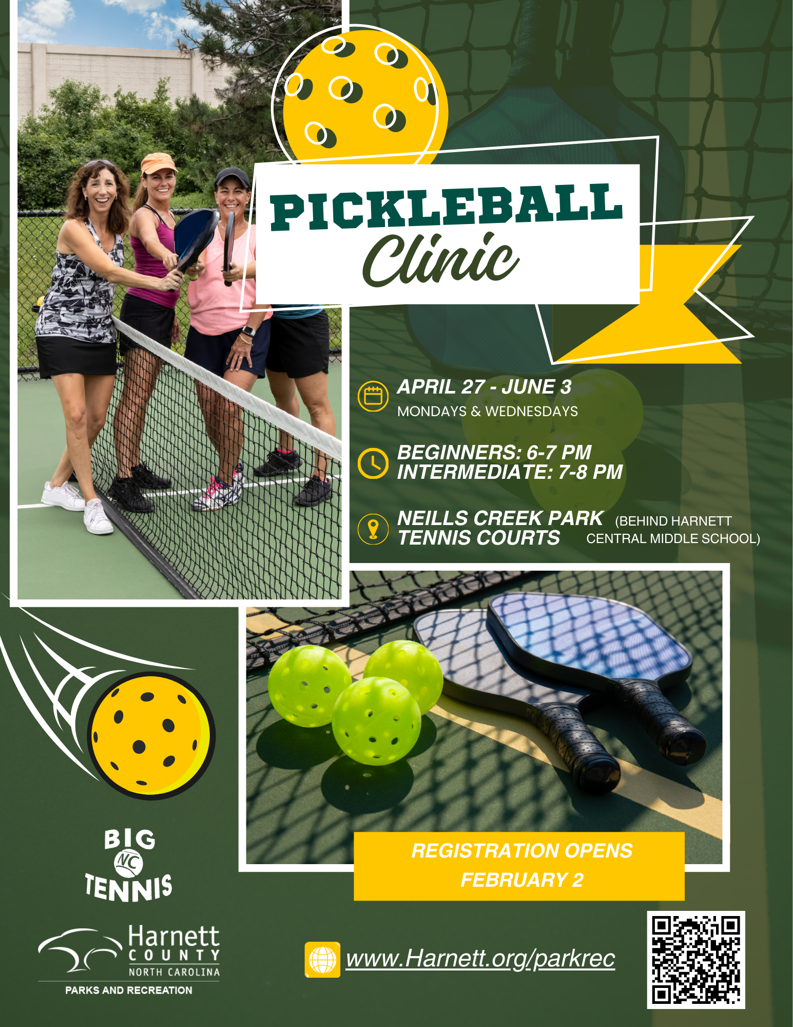 See what the craze is all about! Join us for a six-week beginner-level and intermediate level Pickleball Clinic at the Neills Creek Park Tennis Courts located behind Harnett Central Middle School at 2529 Harnett Central Rd, Angier, NC 27501!